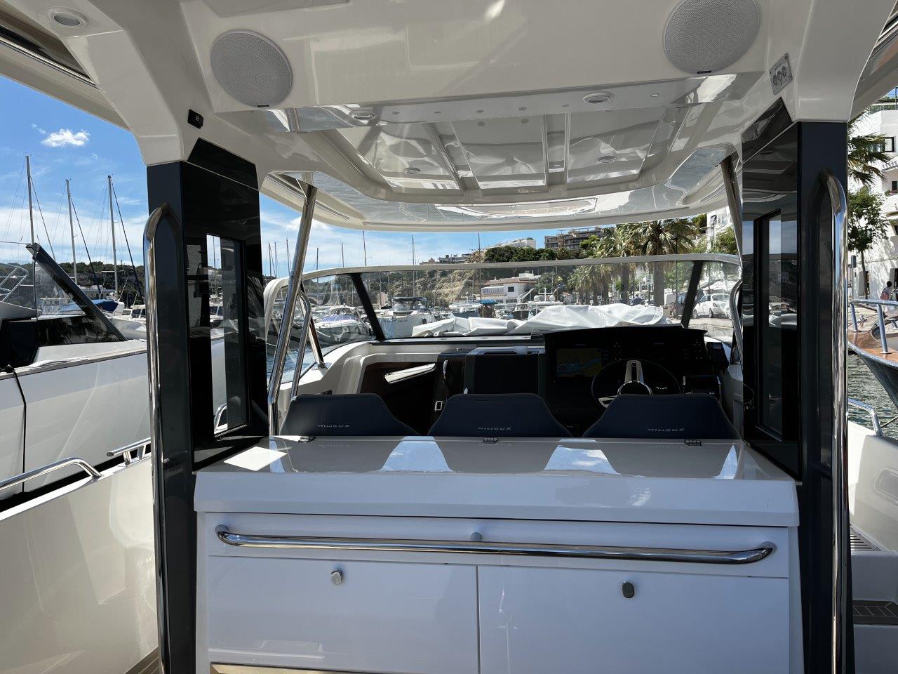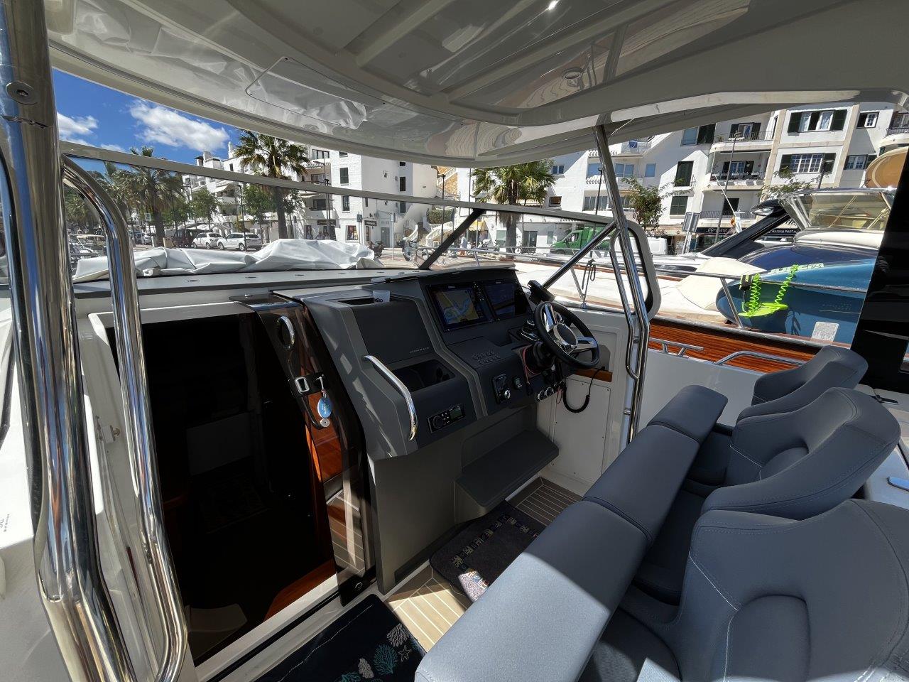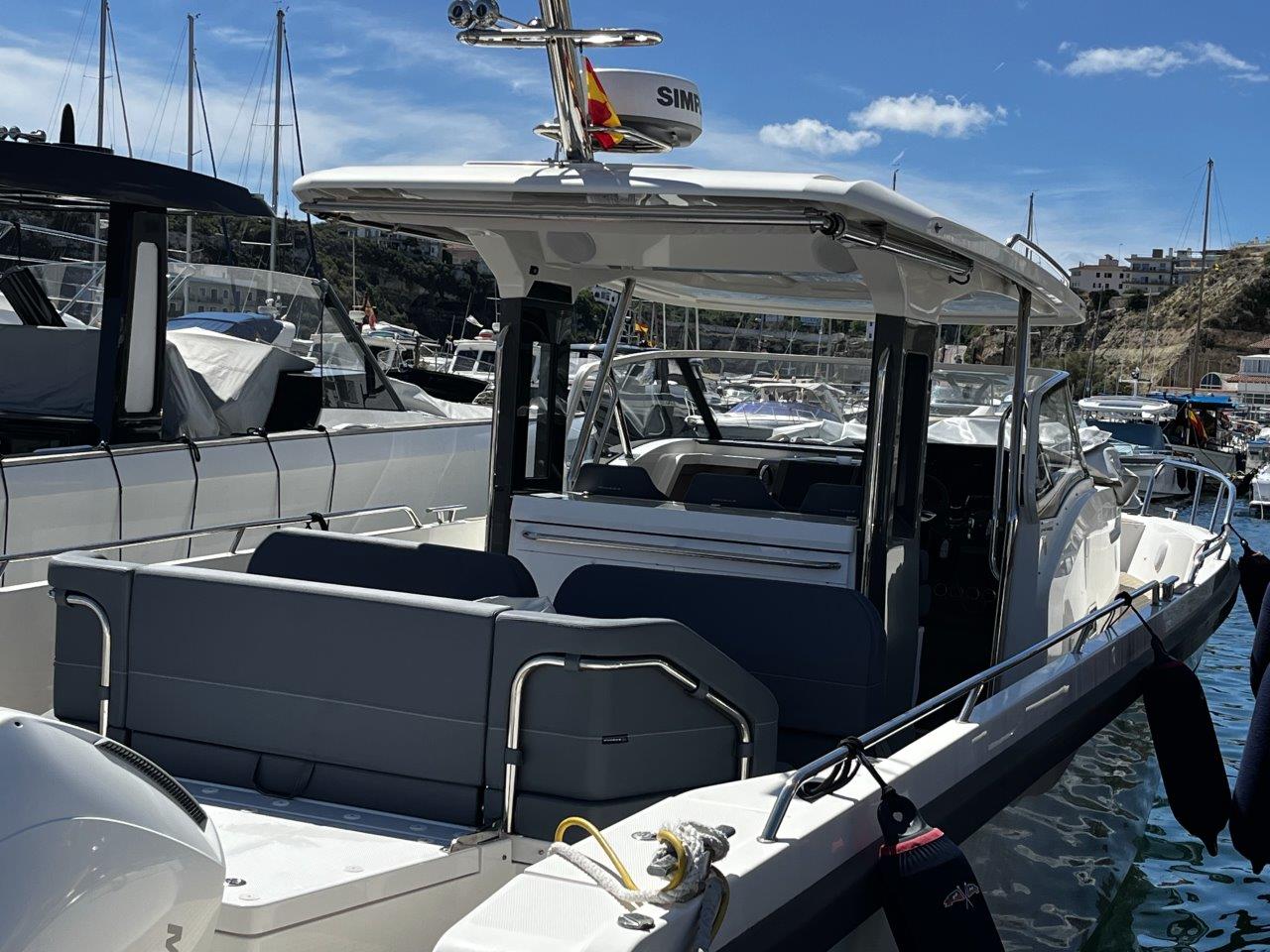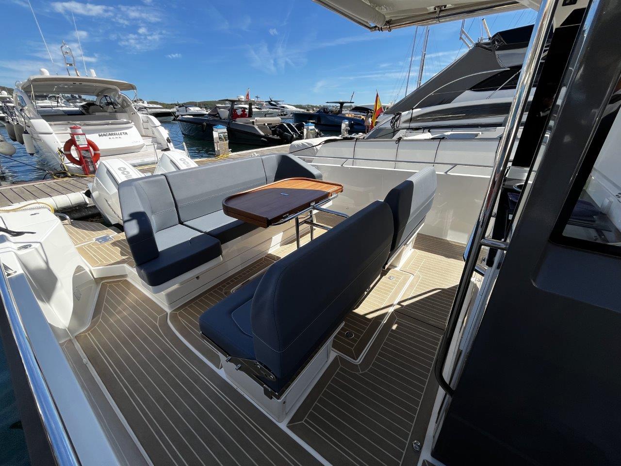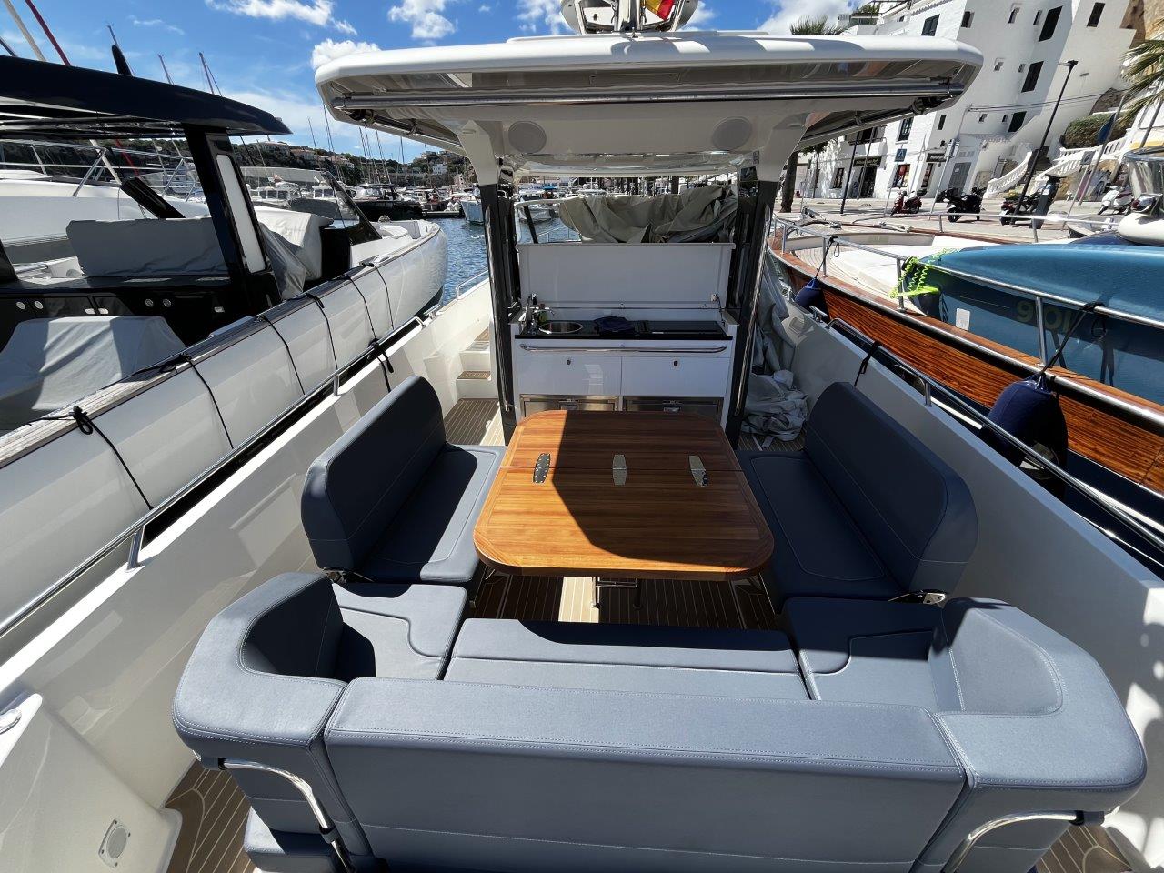 This 2021 model is fitted with powerful and efficient twin Mercury Verado 300 outboards with just 135 hours of use, coupled with joystick control for easy navigation and docking. The highlight of the cockpit is the highly configurable midships lounge space that has multiple seating arrangements to ensure absolute comfort when cruising, dining or sunbathing. There is the optional electric sunshade to provide protection from the sun when needed, as well as a wetbar equipped with a gas cooktop, sink and fridge. The interior consists of two spacious and comfortable cabins to sleep four, with a shared heads with washbasin, separate shower and WC.