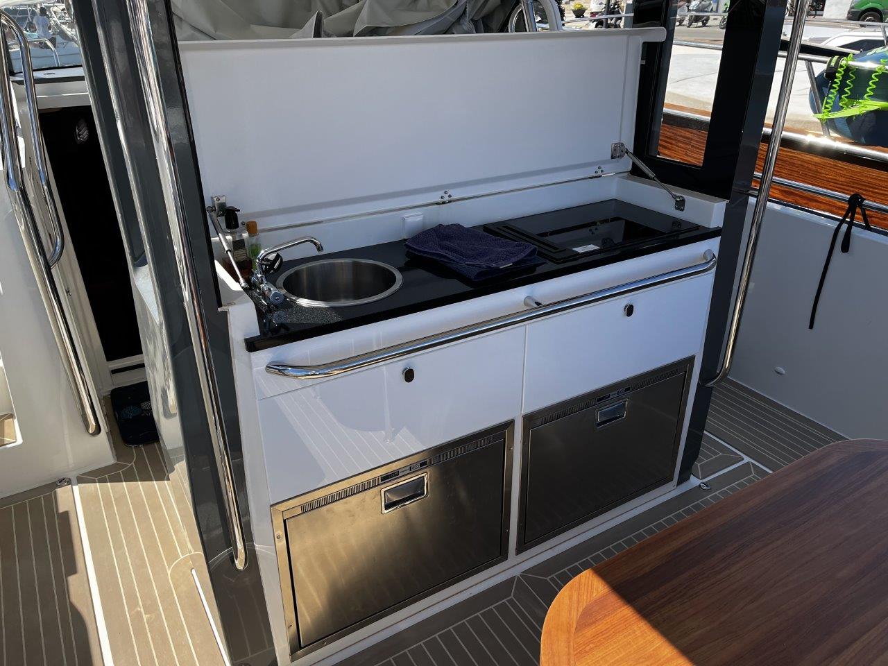 - Outdoor galley with LPG gas cooktop, cold water and fridge (70L)